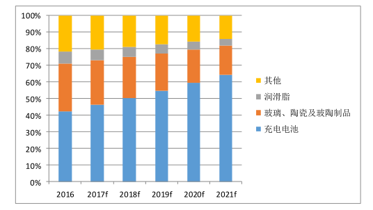 在锂产品消费结构中,可充电电池增速明显,其2011-2016年的年均复合增长率约19.3%,至2016年占锂消费总额的42.35%,成为最主要的用途。